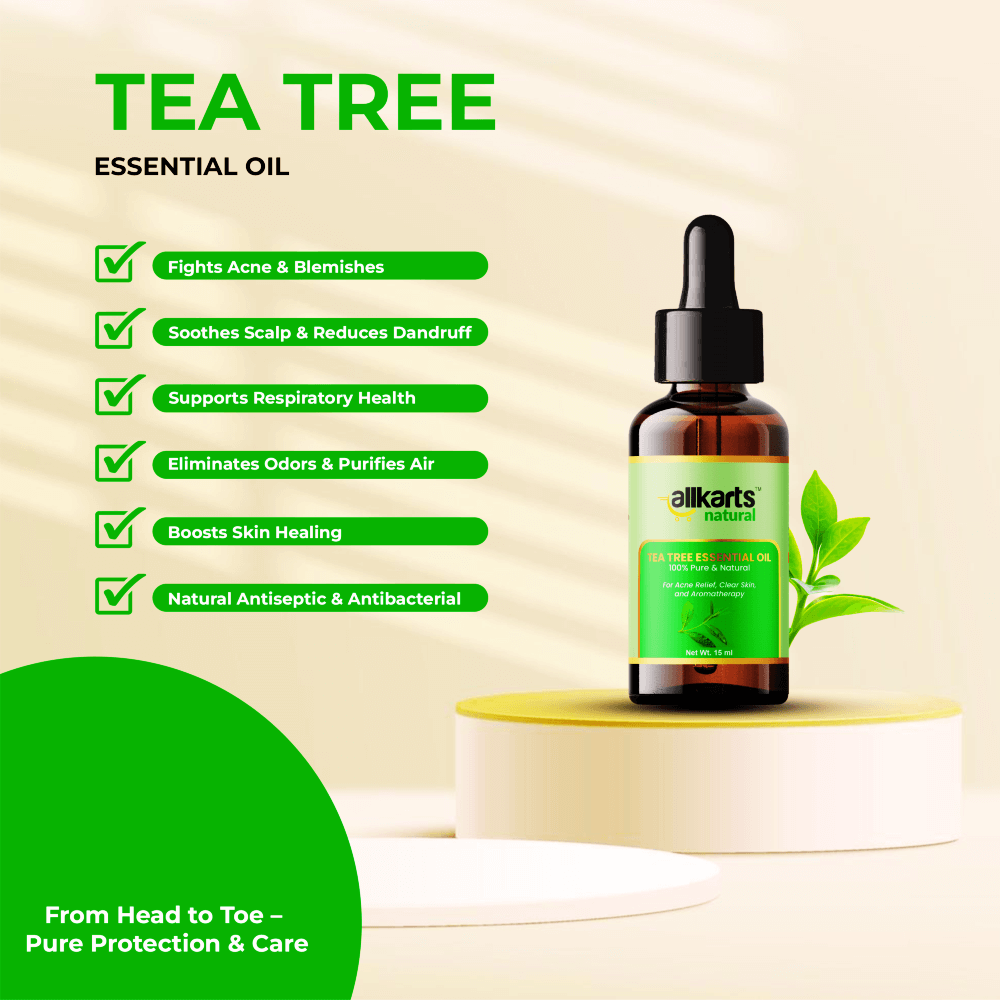 Experience the power of Allkarts Natural Tea Tree Oil, a 100% pure and natural essential oil, perfect for combating acne, promoting healthy skin, and offering a calming aromatherapy experience. Known for its antibacterial and anti-inflammatory properties, tea tree oil is your natural solution for skincare and wellness.