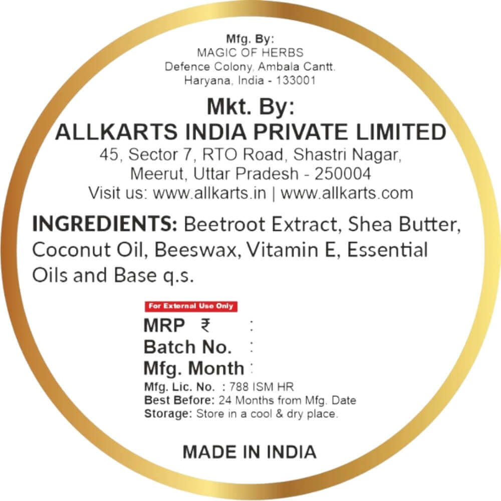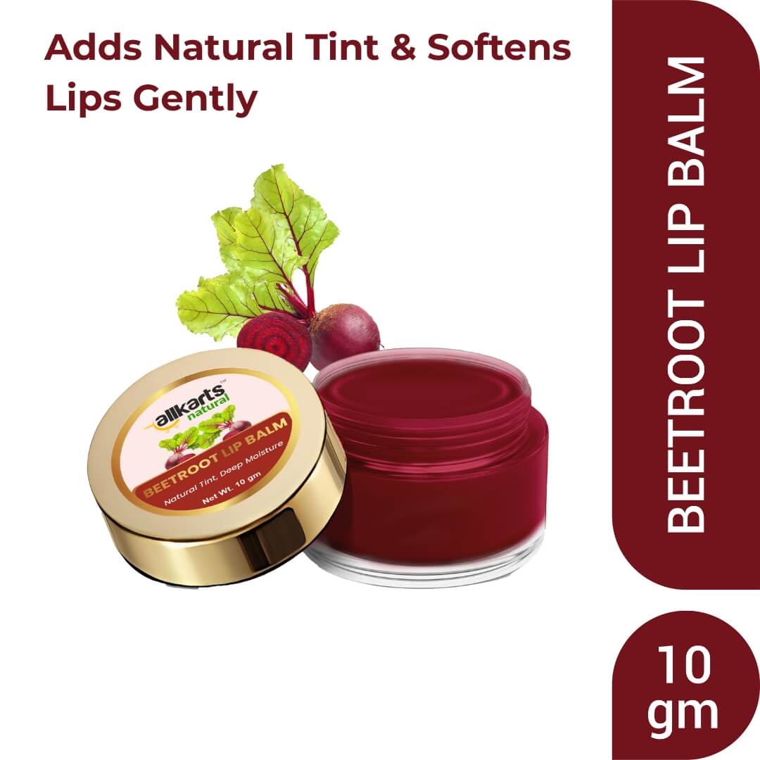 Enriched with the goodness of beetroot extract, shea butter, and coconut oil, Allkarts Natural Beetroot Lip Balm provides deep nourishment and hydration while adding a natural tint to your lips. Its creamy texture glides smoothly, leaving your lips soft, moisturized, and beautifully tinted. Perfect for daily use, it helps repair chapped lips and protects them from dryness.
