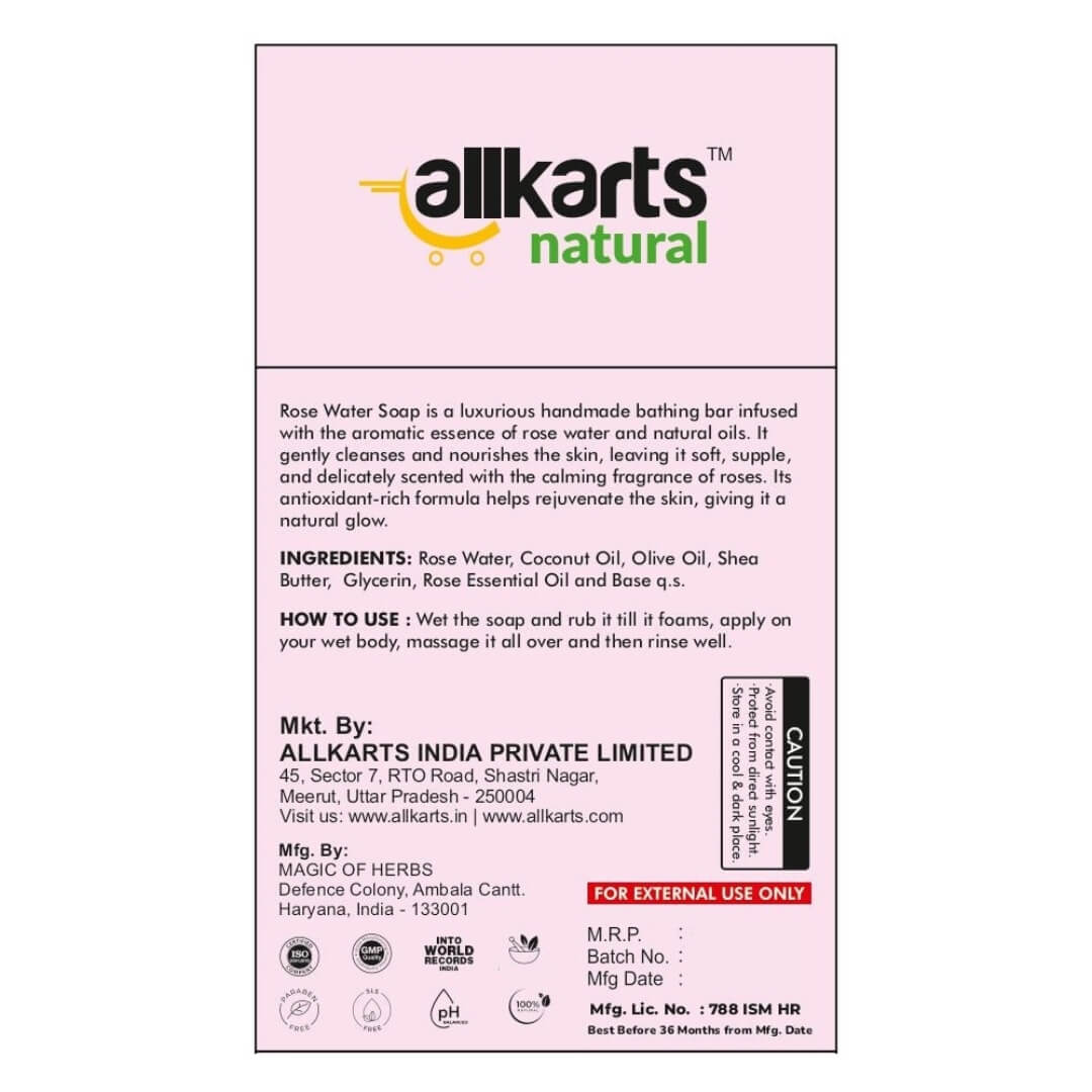 Allkarts Natural Rose Water Soap is a handcrafted bathing bar enriched with the goodness of rose water and natural ingredients. Known for its soothing and hydrating properties, this soap gently cleanses while leaving your skin refreshed, glowing, and delicately scented. Ideal for all skin types, it promotes a soft, supple texture and a radiant appearance.